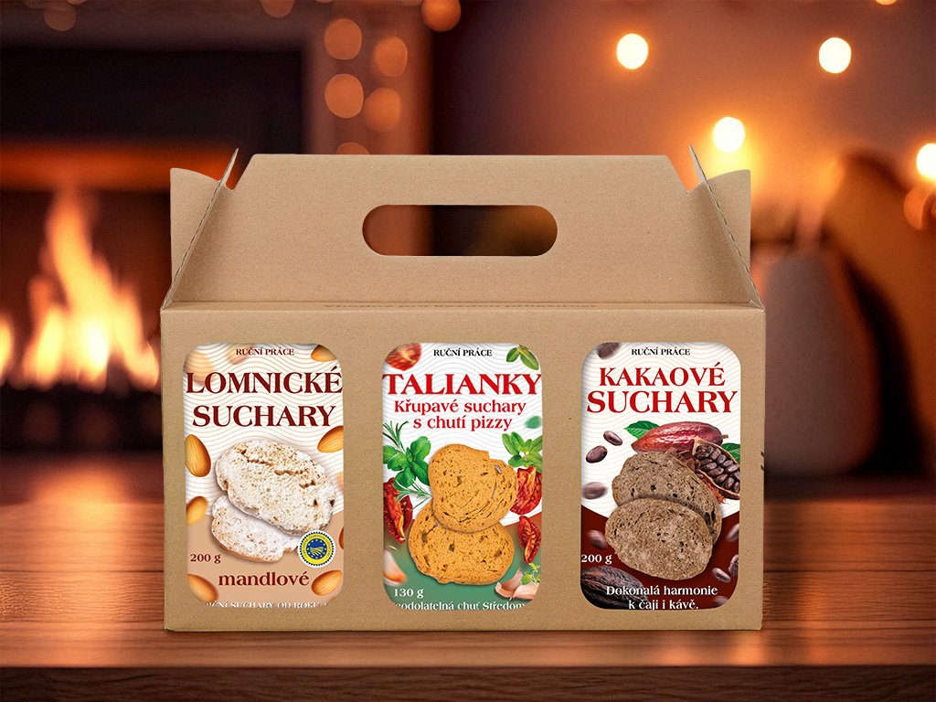 Součástí balení jsou slané suchary v příchutích TALIANKY, Kakaové a jedny tradiční Lomnické suchary.