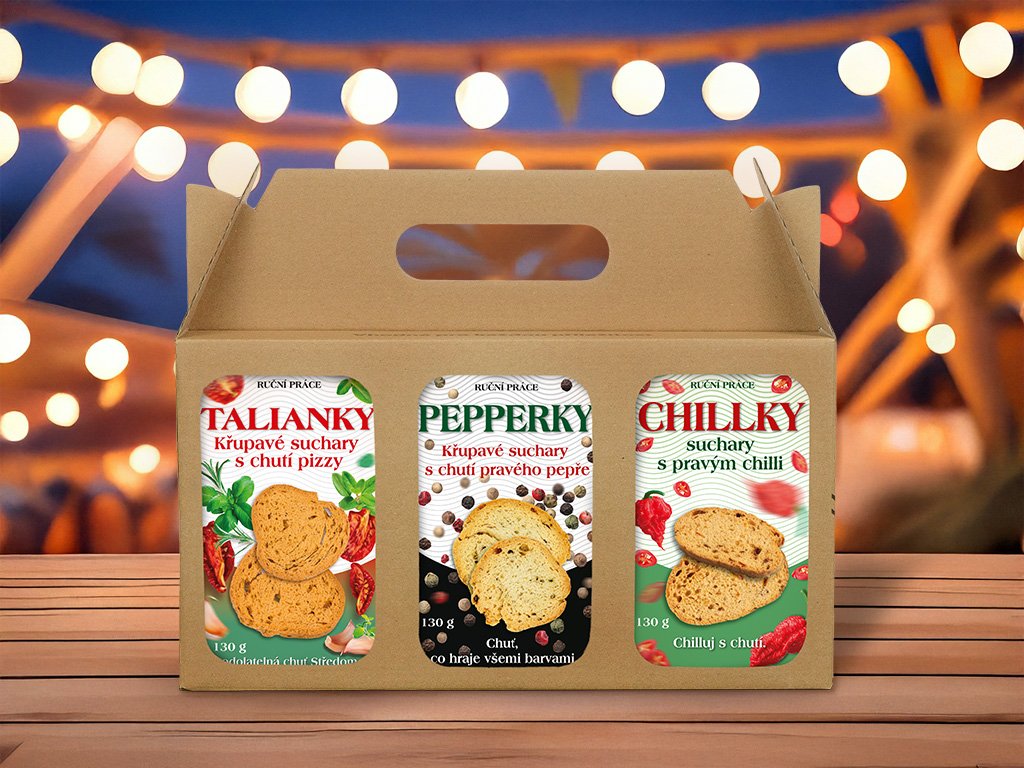 TALIANKY vůně ze směsi provensálských bylin vás okouzlí už při otevření balení, které uchovává jejich aroma po týdny. Příchuť vhodně doplňuje nabídku slané řady křupavých sucharů a vznikla na základě přání našich zákazníků.